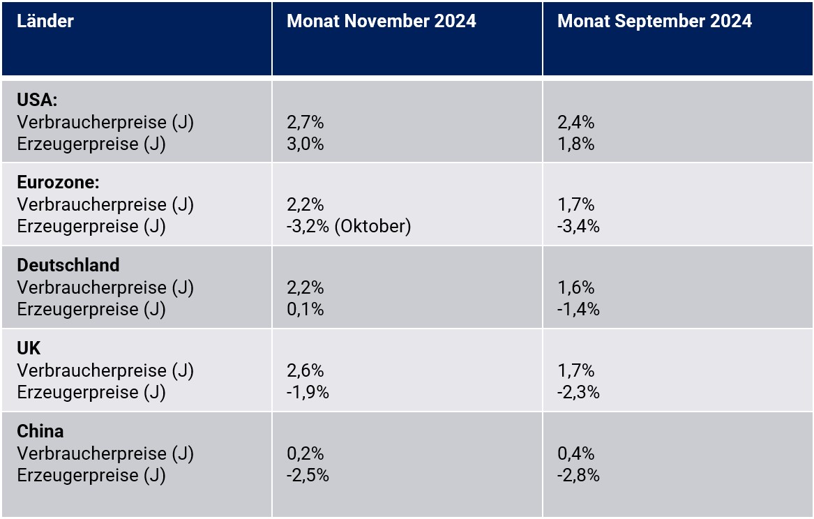In der Eurozone ergab sich als Konsequenz eine Zunahme der Verbraucherpreise in der Phase von September bis November von 1,7% auf 2,2%, in den USA von 2,4% auf 2,7% und in Japan von 2,5% auf 2,9%. Großbritannien verzeichnete von September bis November einen Anstieg von 1,7% auf 2,6%. Im Verlauf des 4. Quartals bestätigte sich das Disinflationsbild in China mit einem Anstieg der Verbraucherpreise um zuletzt nur noch 0,2% und einem Rückgang der Erzeugerpreise um 2,5%.
