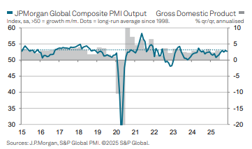 Die in die Zukunft gerichteten Wirtschaftsdaten deuten in Richtung einer soliden Dynamik der Weltkonjunktur. Der von JP Morgan für die Weltwirtschaft ermittelte Einkaufsmanagerindex für die Gesamtwirtschaft (Global Composite PMI) signalisierte per November 2025 mit 52,7 Punkten einen hohen Indexwert Der Dienstleistungssektor trug dazu wesentlich bei.