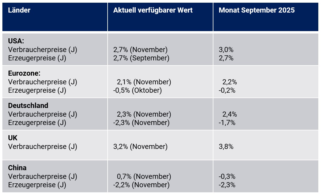 In der Eurozone ergab sich bei den Verbraucherpreisen seit September ausgehend von 2,2% ein Rückgang auf 2,1% per November. In den USA kam es in diesem Zeitraum zu einem Rückgang von 2,9% auf 2,7% und in Großbritannien zu einer Reduktion von 3,8% auf 3,2%. In Japan verharrte der Verbraucherpreisanstieg in diesem Zeitfenster bei 2,9%. Im 4. Quartal 2025 stellte sich bei den Verbraucherpreisen in China im Verlauf ausgehend von -0,3% im September ein Anstieg auf 0,7% per November 2025 ein. In Indien, das grundsätzlich von höheren Inflationsraten geprägt war, sank der Anstieg der Verbraucherpreise von 1,54% per September auf 0,71% per November 2025.